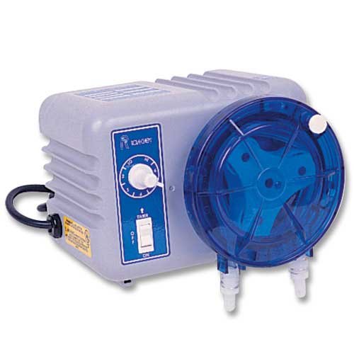 Rola-Chem peristaltic chemical feed pumps are enclosed in vented, unbreakable stainless-steel cases and feature built-in, solid-state timers. Rola-Chem pumps are designed with 3-way bypass switches. They can be run on the timer position for interrupting action or can run continuously when in the on position. The heavy-duty air-cooled motor has a thermal overload protection system and a maximum pressure of 30 pounds per square inch. Pump heads are molded of Lexan high-impact polycarbonate resin for durability. Read more...