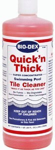 Bio-Dex Quick 'n Thick Tile Cleaner (1 QT)Swimming Pool Tile Cleaner and Vinyl Liner CleanerBio-Dex Quick 'n Thick is especially directed to cleaning dirt, grease, oil stains, suntan lotions, and body oils from swimming pool tile. Quick 'n Thick is not designed to remove heavy calcium stains. To remove heavy calcium build-up from swimming pool tile, use Bio-Dex #300 Tile Cleaner. Quick 'n Thick makes for terrific cleaning. It easily removes soil and scum from vinyl liners.No FumesBio-DegradeableNon-FlammableNon-CarcinogenicGuaranteed to work when used as directed.You may add additional acid to create a thicker solution. For additional product speculations and instructions for safe Quick 'n Thick use, please see the Bio-Dex Quick 'n Thick Manual. Read more...