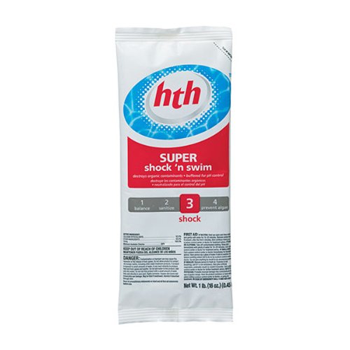 16 x 1 lb Bags of HTH Super Shock N Swim. Give your pool a blast of algae and germ-killing power with HTH Super Shock N Swim! HTH super swimming pool shock is 15% stronger than regular HTH Shock. HTH Super Shock contains 53% available chlorine. HTH pool super shock is ideal for weekly preventative shock treatments as well as killing existing algae. Ideal for use with vinyl, concrete and all other swimming pool surfaces. Safe enough for swimming immediately after shock treatments. Add HTH Super Shock while your filter pump is running. Formula is buffered to reduce pH fluctuations. Fast dissolving formula. Contains calcium hypochlorite. Dosage = 1 pound per 12,000 gallons. Economically priced. Read more...