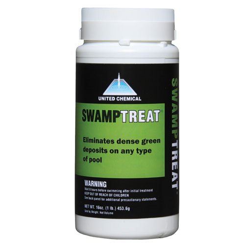 Swamp Treat will eliminate algae in any type of pool in 24 hours or less! Swamp Treat is the most powerful formula on the market, guaranteed to clean the worst algae blooms, fast! Your pool will go from a green swamp to blue in as little as a few hours. As the filtration system kicks in, Swamp Treat accelerates your chlorine's ability to fight algae blooms and the pool will clear. A 1 lb. bottle will treat 20,000 gallons, and do in one treatment what other products take multiple times to do - and do it faster. The non-toxic formula does not contain any metals, will not stain your pool or affect water balance. NOTE: Be sure to pre-dissolve the chlorine and broadcast the solution on top of the pool, don't pour it down the sides. Read more...